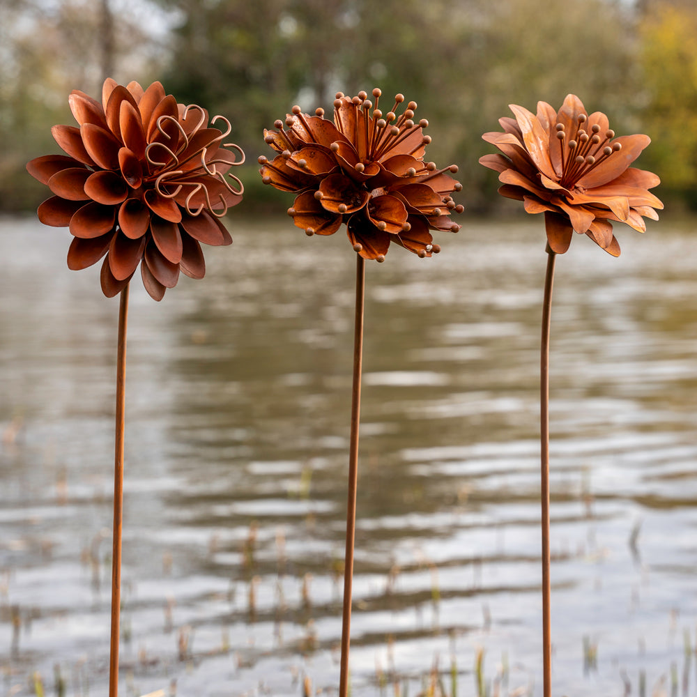 Small Metal Garden Flower Sculptures | Wild Anemone, Starburst Allium & Blooming Dahlia