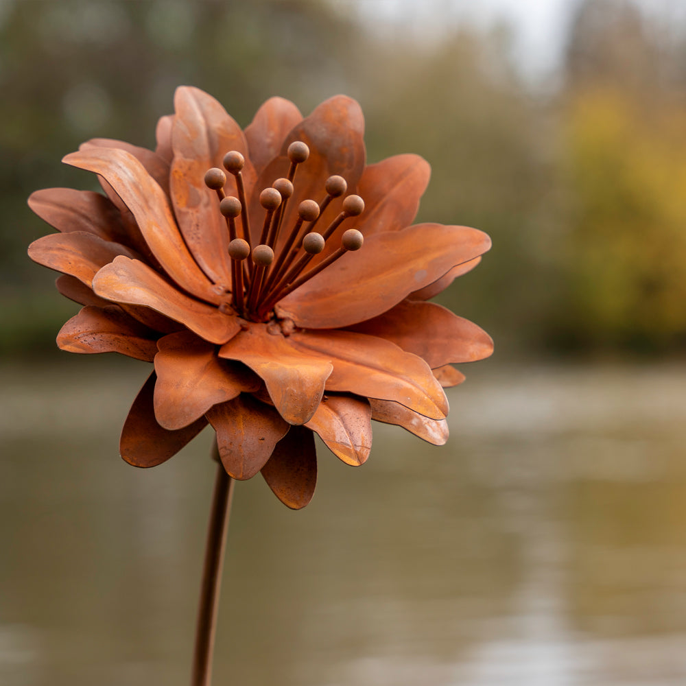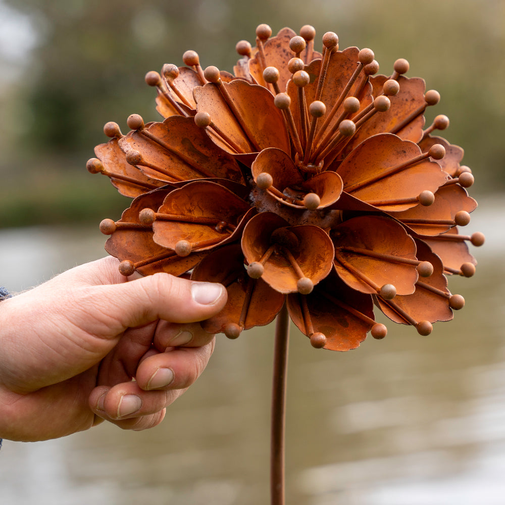 Each piece—wild anemone, starburst allium, and dahlia—captures the charm of English spring blooms in richly textured, naturally rusted metal.