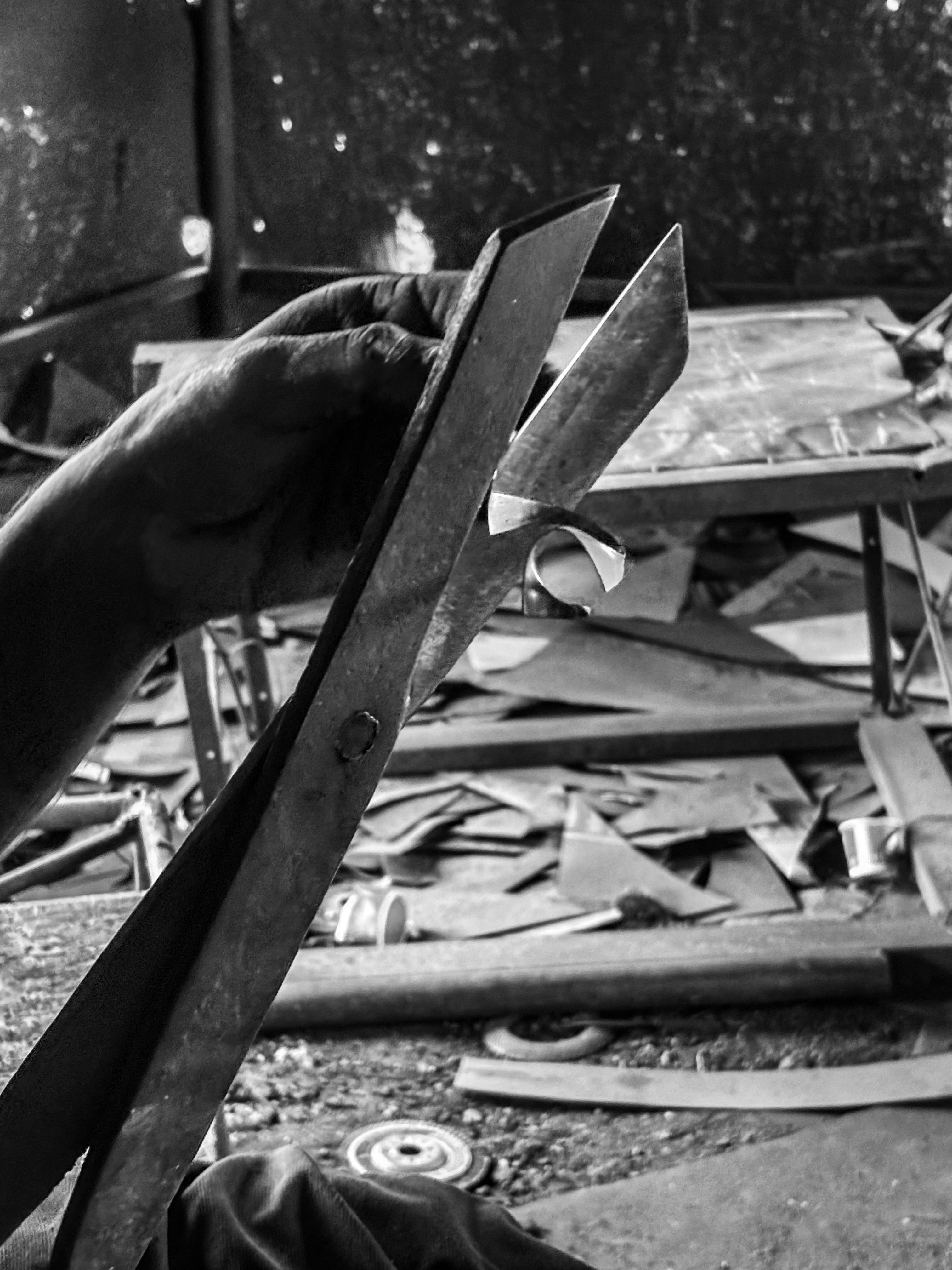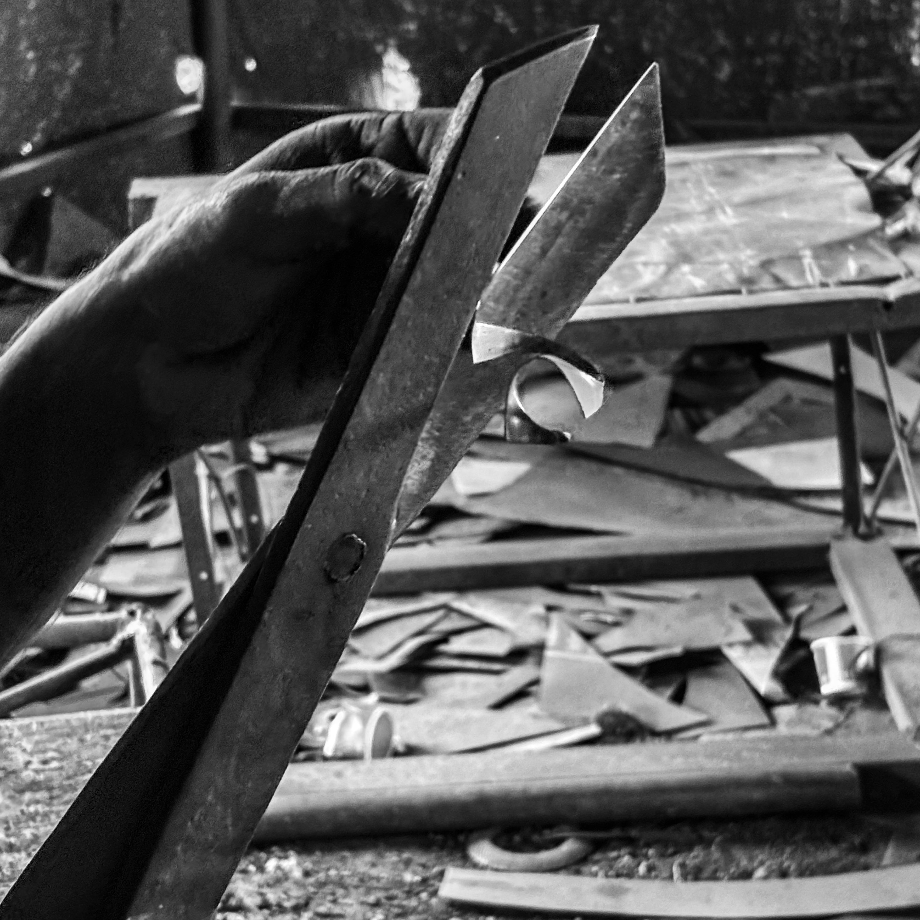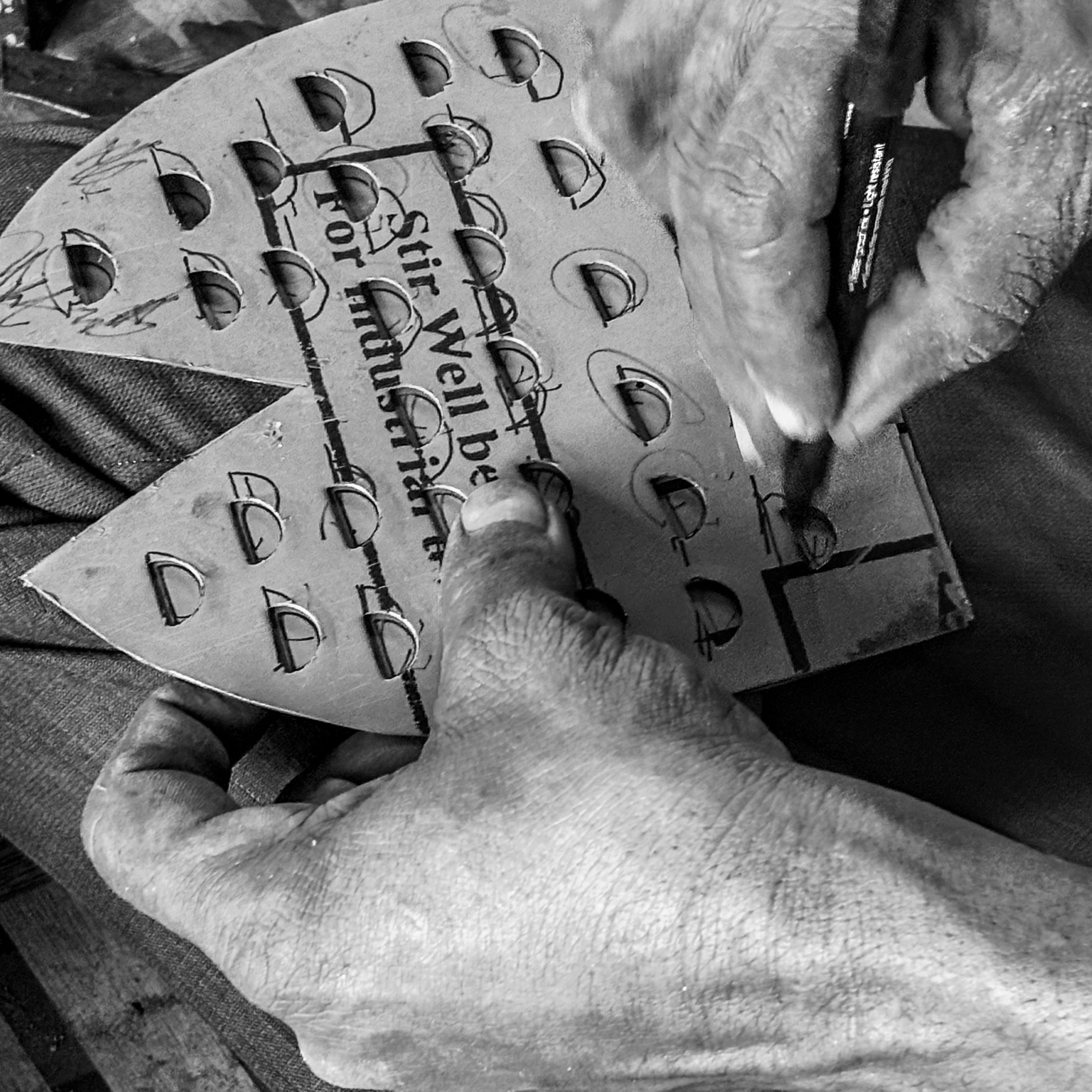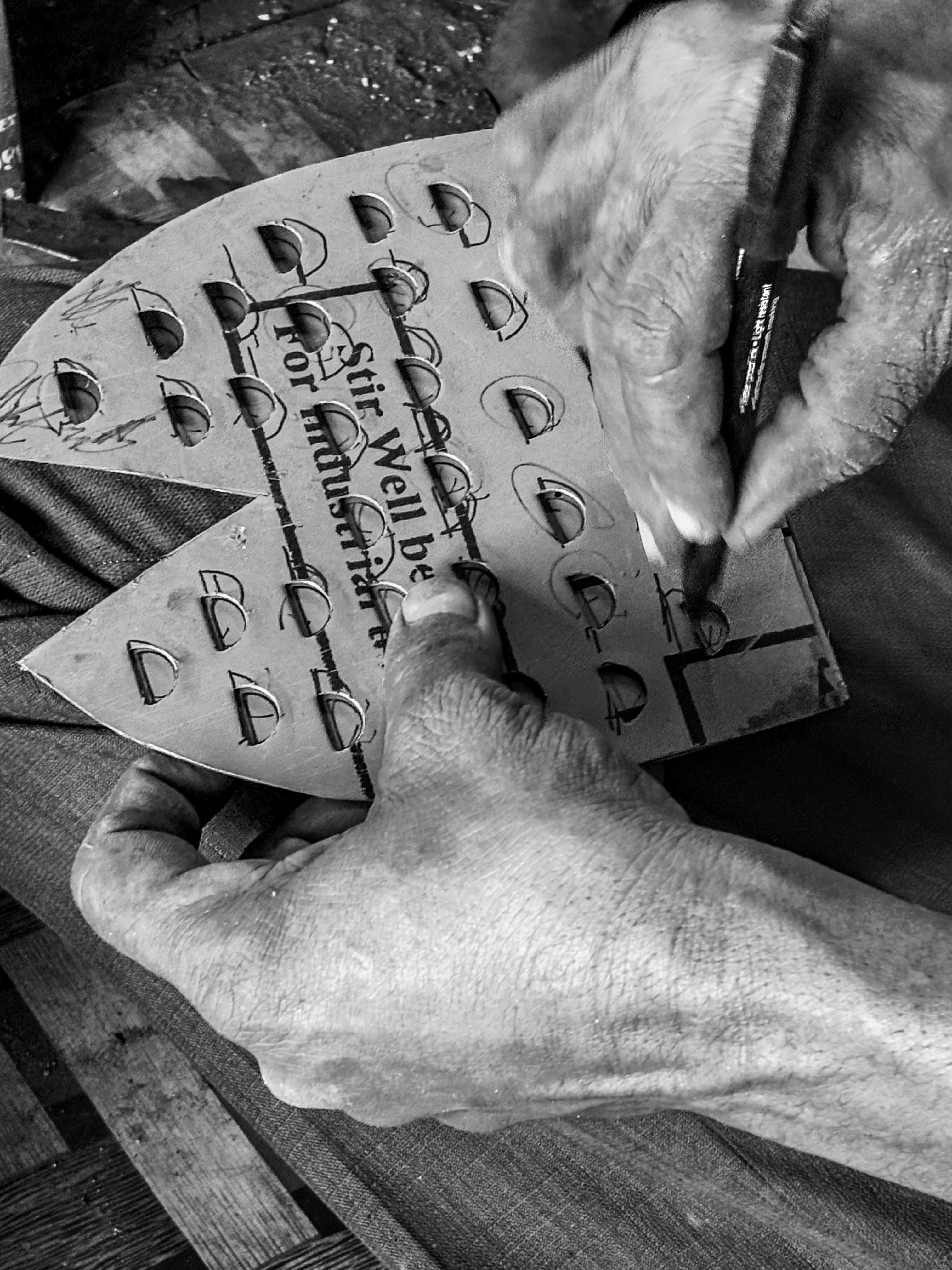 Using the prepared metal, the craftsperson carefully marks and cuts each sheet to the precise templates required for the final design.