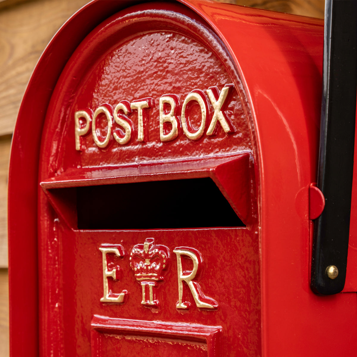The post box itself is based on the original George VI classic. It is embossed with beautifully stylised lettering and a royal crown motif. All of which is embellished in gold coloured paint which contrasts so well against the black.